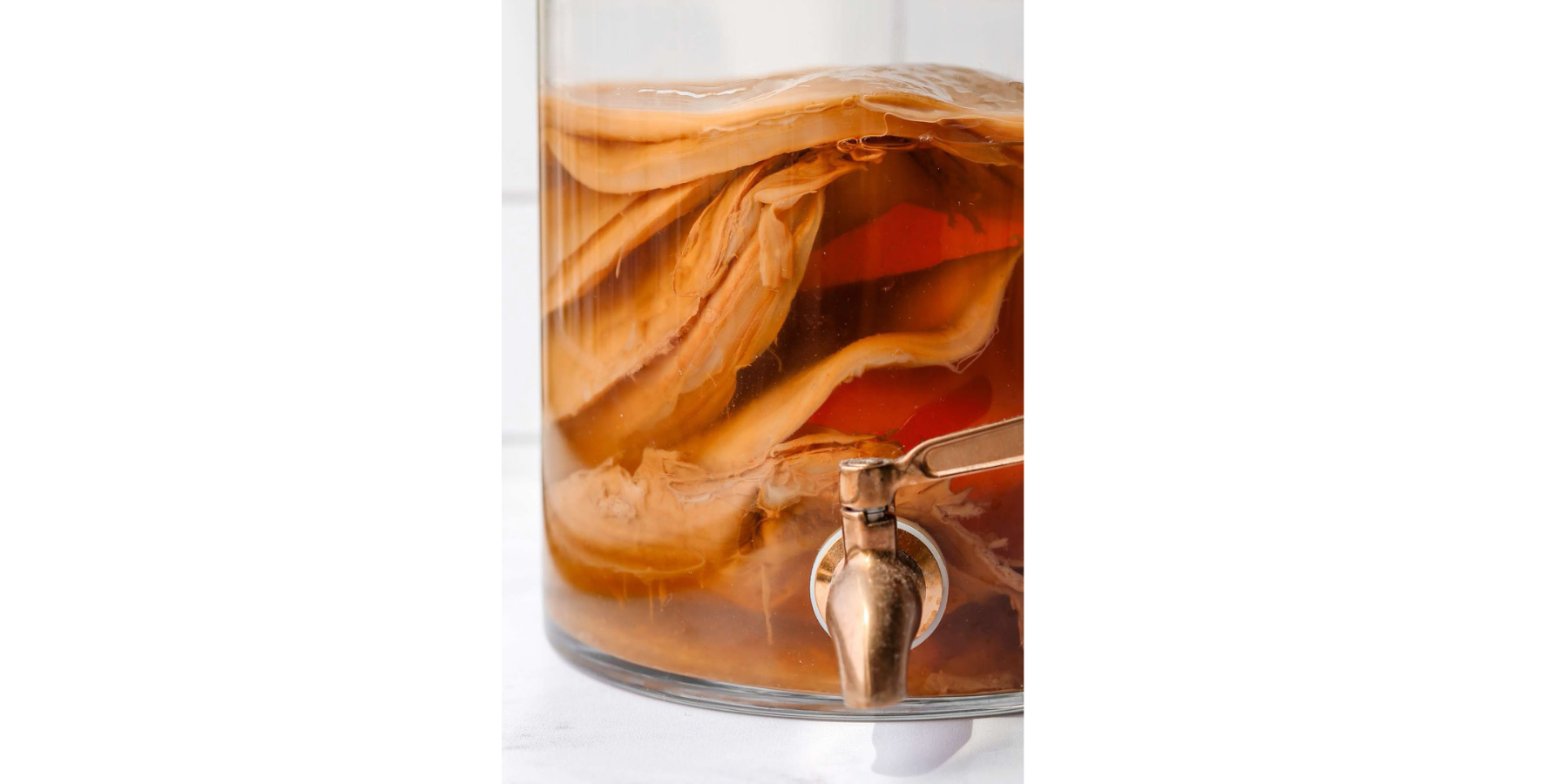 Để làm Kombucha, bạn cần một con giống gọi là Scoby. Nhìn nó giống như một miếng thạch dừa khổng lồ, trơn tuột, màu trắng ngà hoặc nâu nhạt.